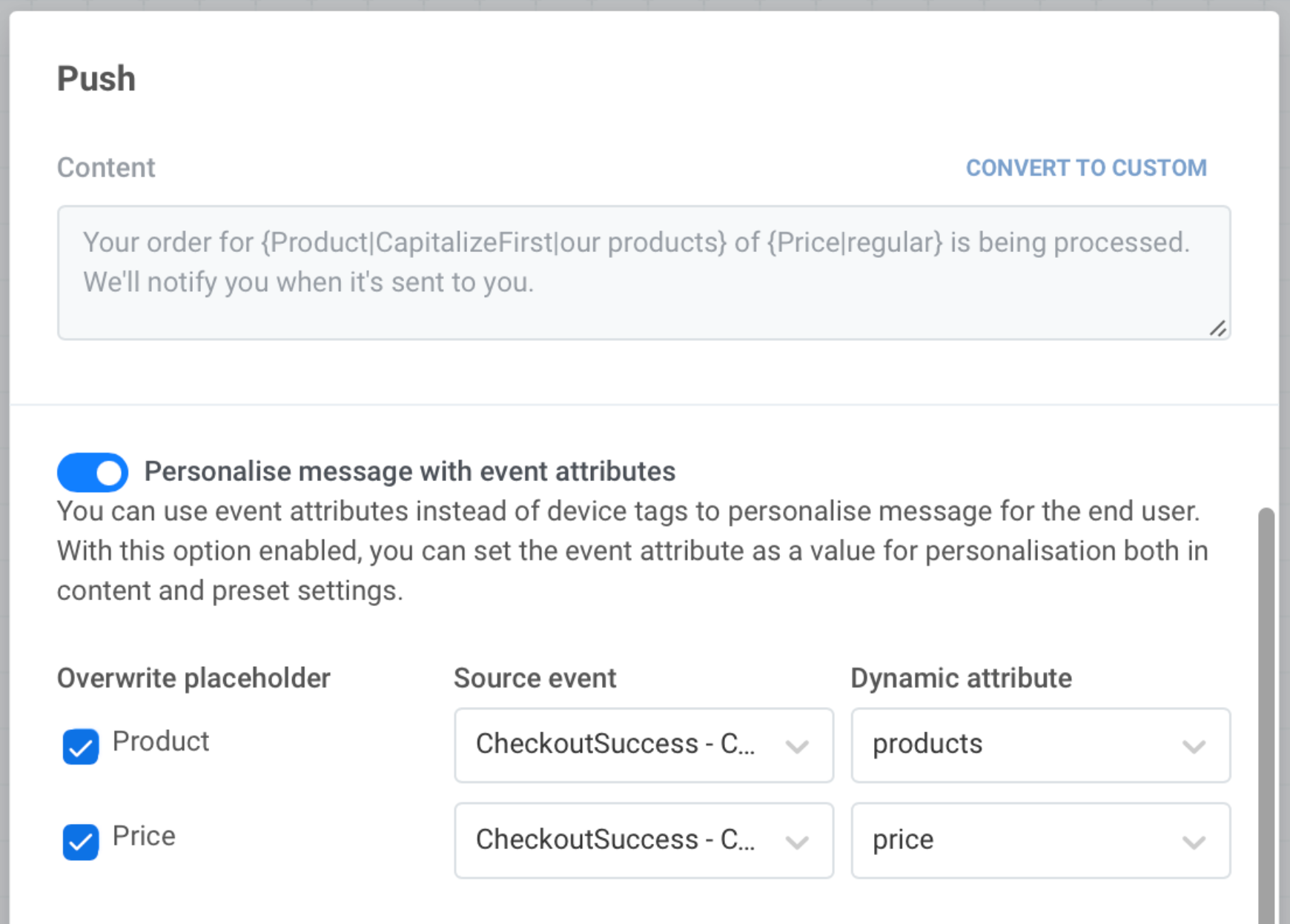Section titled “Персонализация с помощью Dynamic Content”Чтобы персонализировать сообщение с помощью Dynamic Content, активируйте переключатель Персонализировать сообщение с атрибутами Event при настройке элемента Push или Email на вашем Journey canvas. Выберите плейсхолдер (или несколько плейсхолдеров) для персонализации, который будет заполнен атрибутами Event.