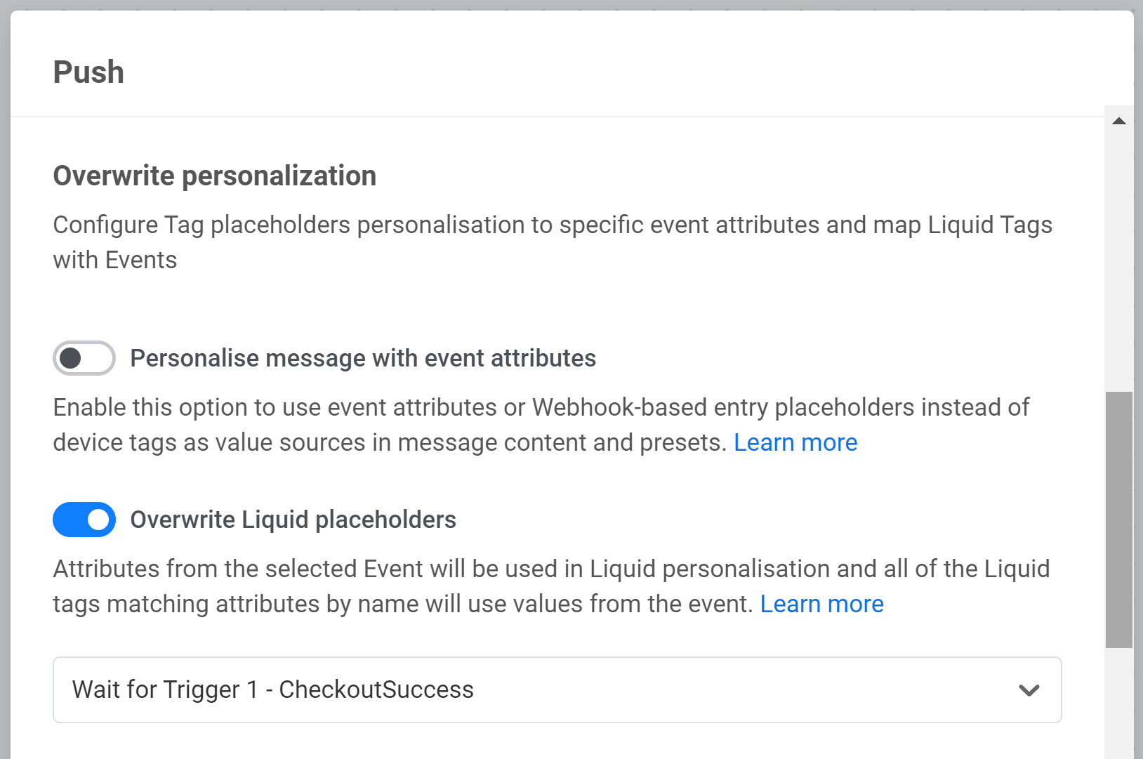 Section titled “Персонализация с помощью Liquid Templates”Чтобы персонализировать сообщение с помощью Liquid Templates, включите опцию Перезаписать плейсхолдеры Liquid и выберите нужное Event. Если имя атрибута совпадает с именем Tag в сообщении, значение атрибута будет добавлено в текст сообщения.