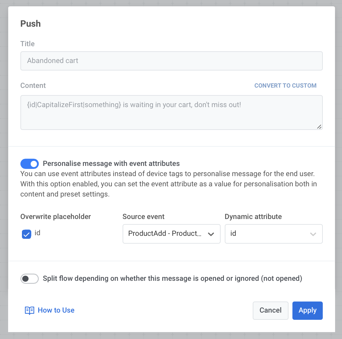 Чтобы повысить релевантность ваших сообщений для участников Journey, вы можете добавлять персонализированный контент на основе поведения пользователей. Например, при отправке push-уведомления о брошенной корзине добавьте название товара для повышения конверсии — напомните пользователям, что именно они хотели приобрести, чтобы сделать ваше сообщение более убедительным.