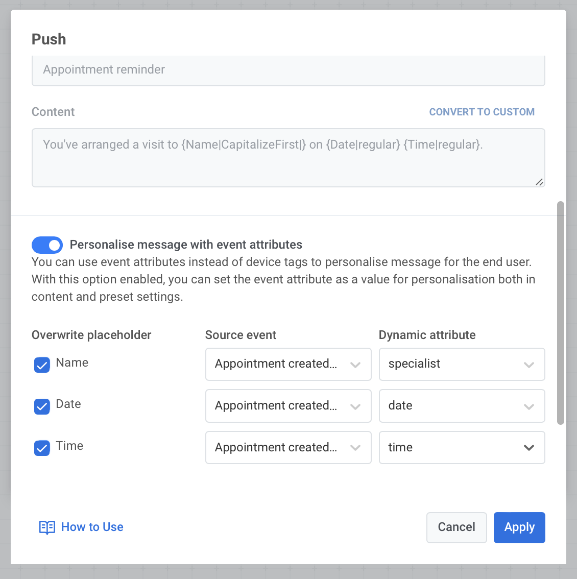 - Настройте push-уведомление, которое будет следовать за стартовым Event. Персонализируйте контент preset с помощью атрибутов Event Appointment created.