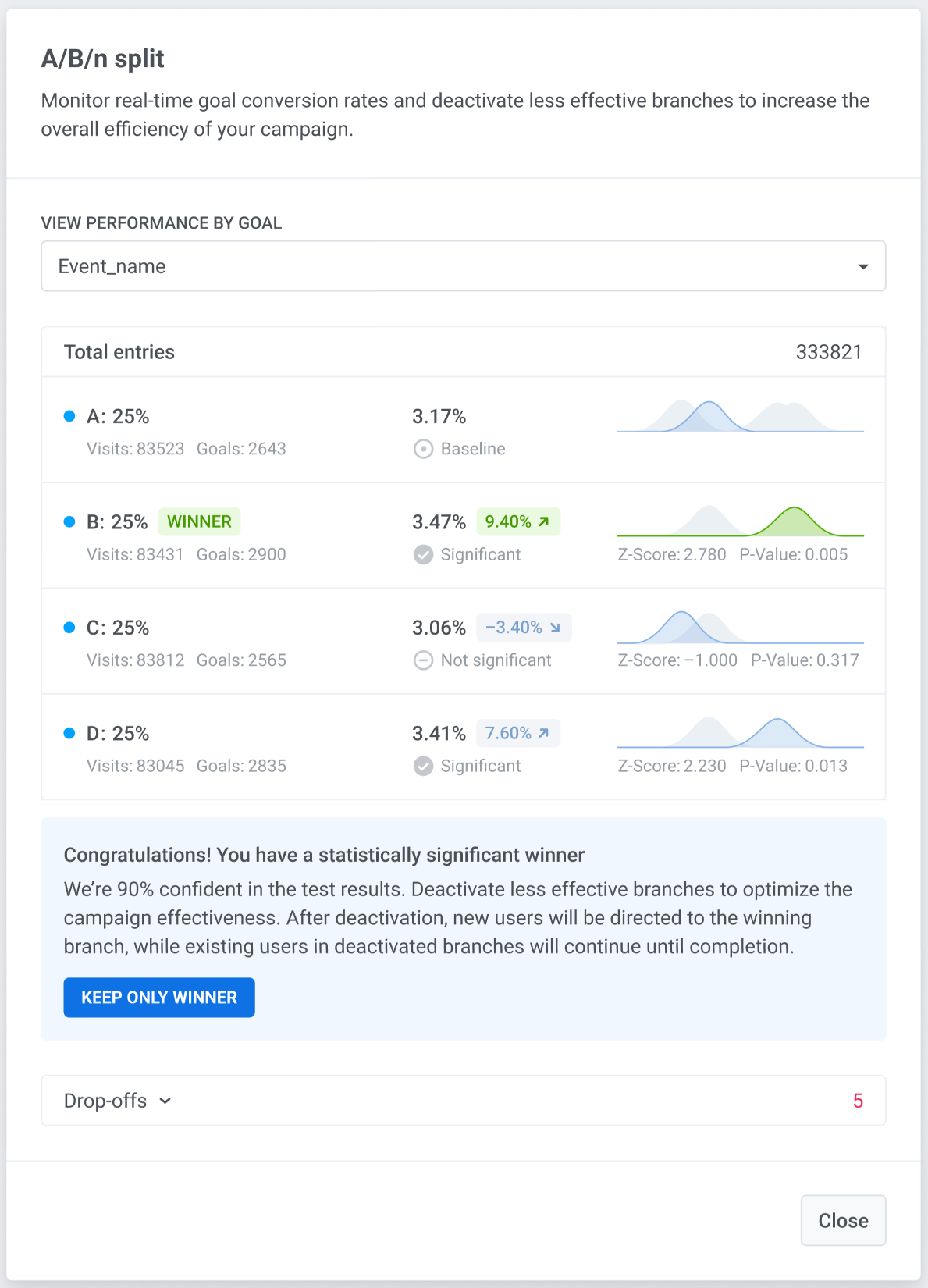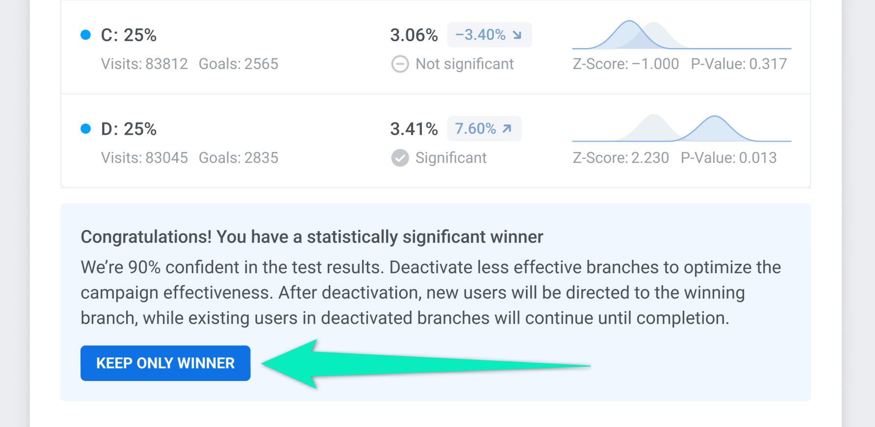 Если у вашего теста есть статистически значимый победитель, вы можете мгновенно отключить менее эффективные ветки, нажав Оставить только победителя (Keep only winner). Новые участники Journey будут направлены в победившую ветку. Пользователи, которые уже попали в деактивированные ветки, продолжат проходить по ним до завершения Journey.