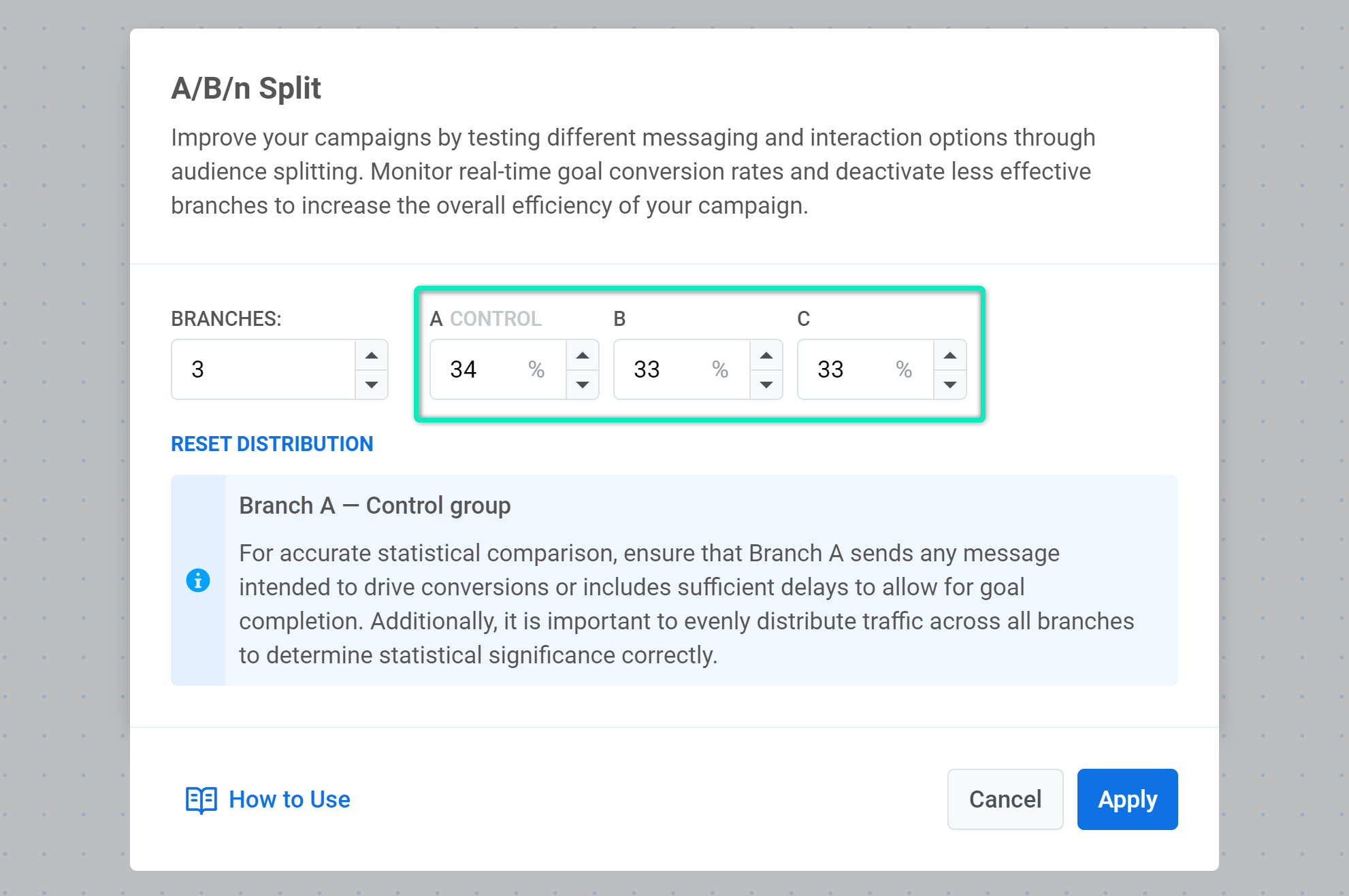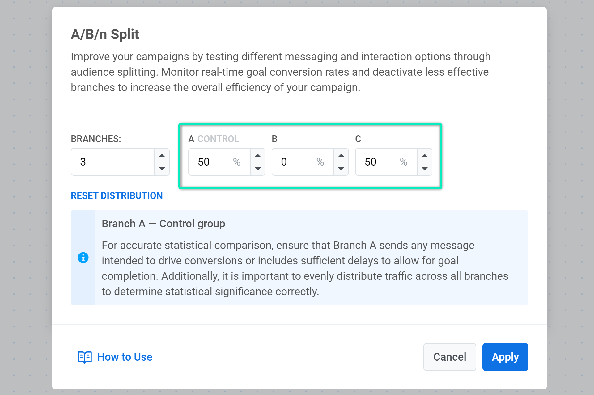 - Установите процент пользователей, которые попадут в каждую ветку. Сумма по всем веткам должна составлять 100%. В соответствии с установленным вами процентом участники Journey, достигшие этого шага, будут случайным образом разделены на указанное количество веток.