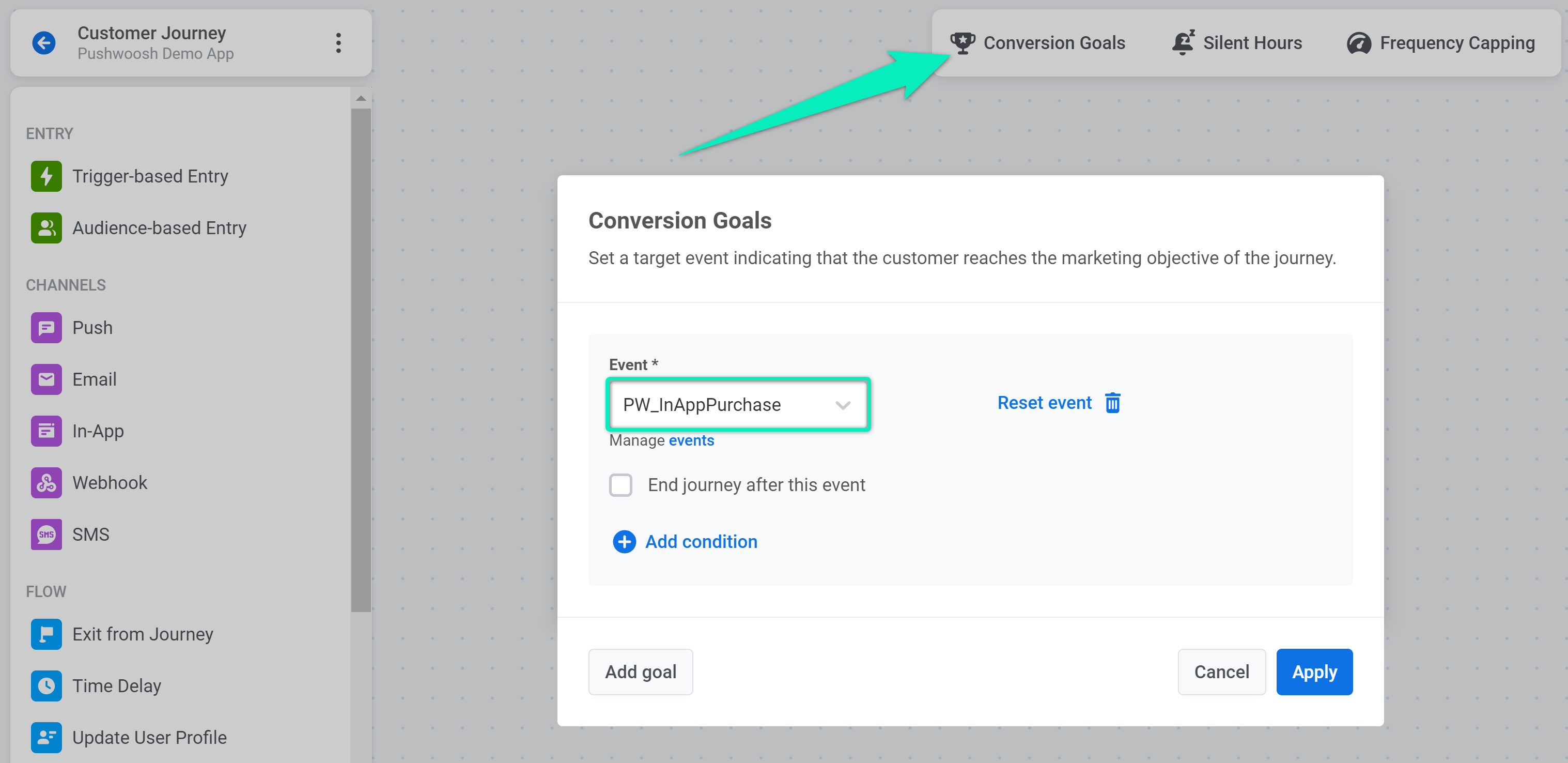 Установите хотя бы один Conversion Goal, который будет использоваться для расчета результатов теста. Например, если вы хотите проверить, какой из двух Push является наиболее эффективным, вы можете установить Event PW_InAppPurchase в качестве Conversion Goal.