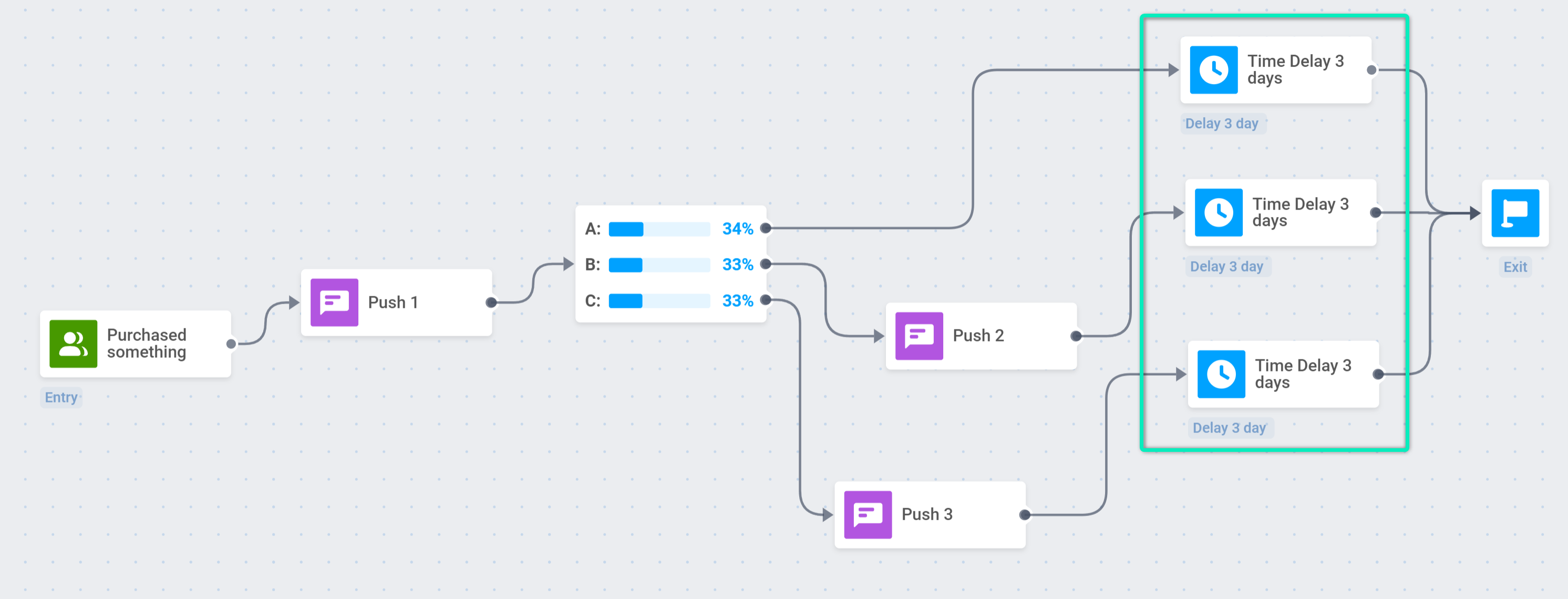 - Тестирование существующей версии без какой-либо коммуникации в сравнении с новыми сценариями коммуникации. Например, вы хотите добавить еще один Push в конце Journey, чтобы увидеть, повысится ли эффективность кампании по сравнению с исходной версией без этого Push. В этом случае “пустая” версия должна быть представлена в ветке А. Для получения надежных результатов добавьте одинаковый Time Delay в каждую ветку: