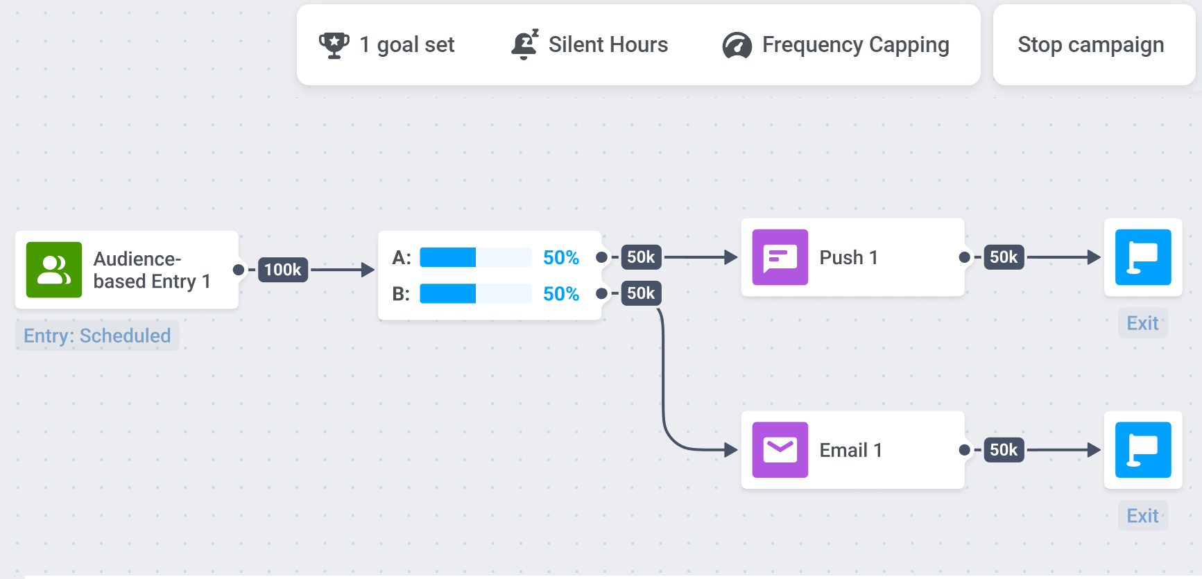 - Тестирование только новых версий друг против друга. Поскольку старого сценария коммуникации нет, одна из новых версий будет помечена как контрольная группа (та, что представлена в ветке А). Убедитесь, что Conversion Goal может быть достигнут во всех ветках.