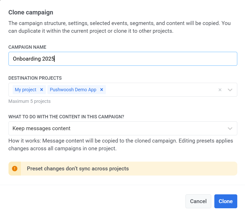 Keep messages content: Копирует контент сообщений в клонированную кампанию. Редактирование пресетов применит изменения ко всем кампаниям в рамках одного и того же проекта.