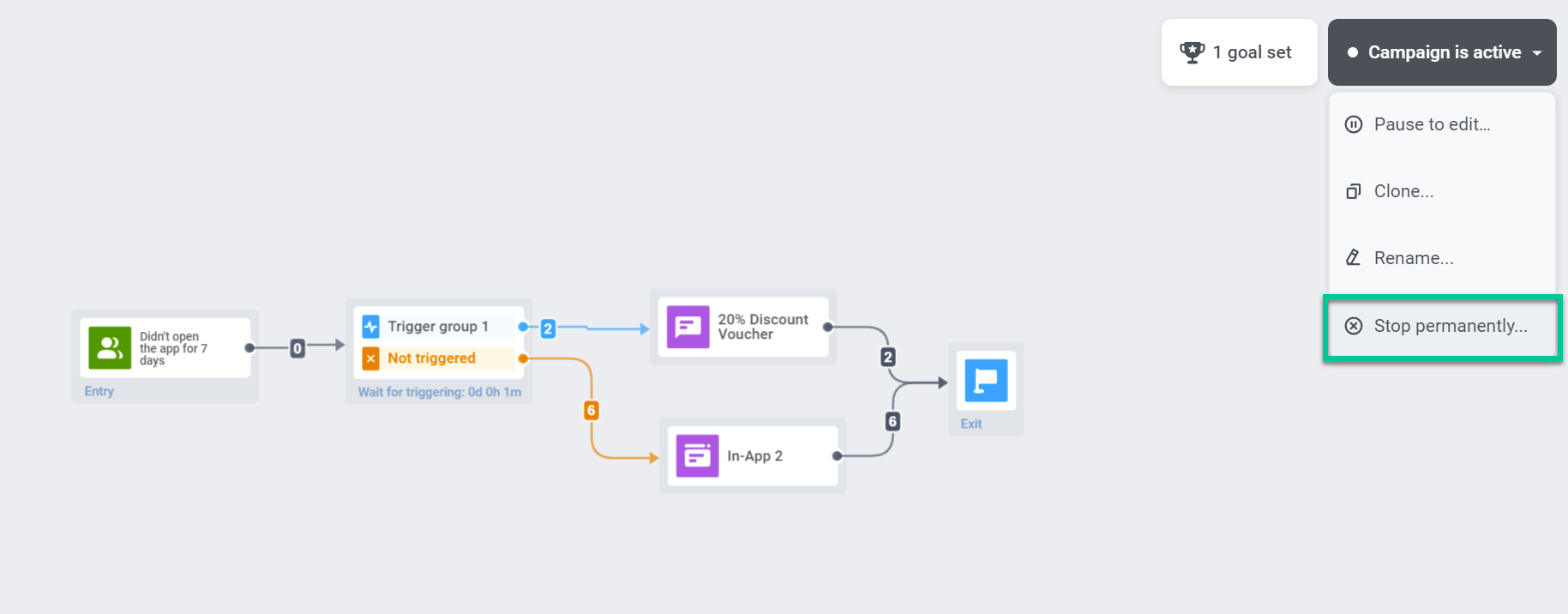 Section titled “Деактивация”Чтобы остановить активный Journey, нажмите Stop campaign.
