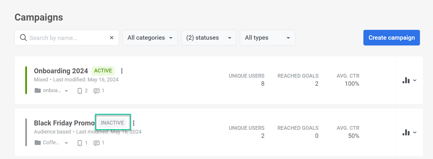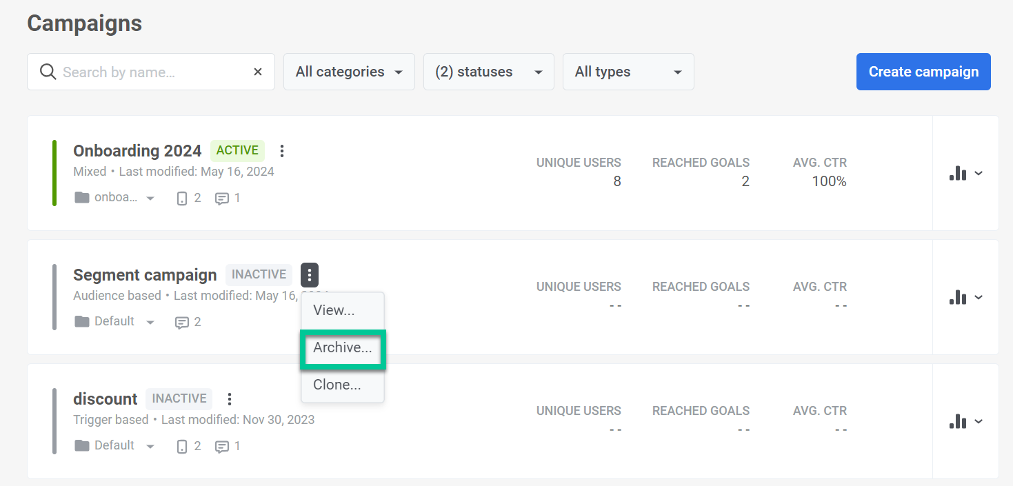Section titled “Архивирование”Если у вас много неактивных Journey, вы можете заархивировать их, чтобы список кампаний оставался удобным для навигации. Архивированные Journey можно клонировать так же, как и кампании из основного списка.