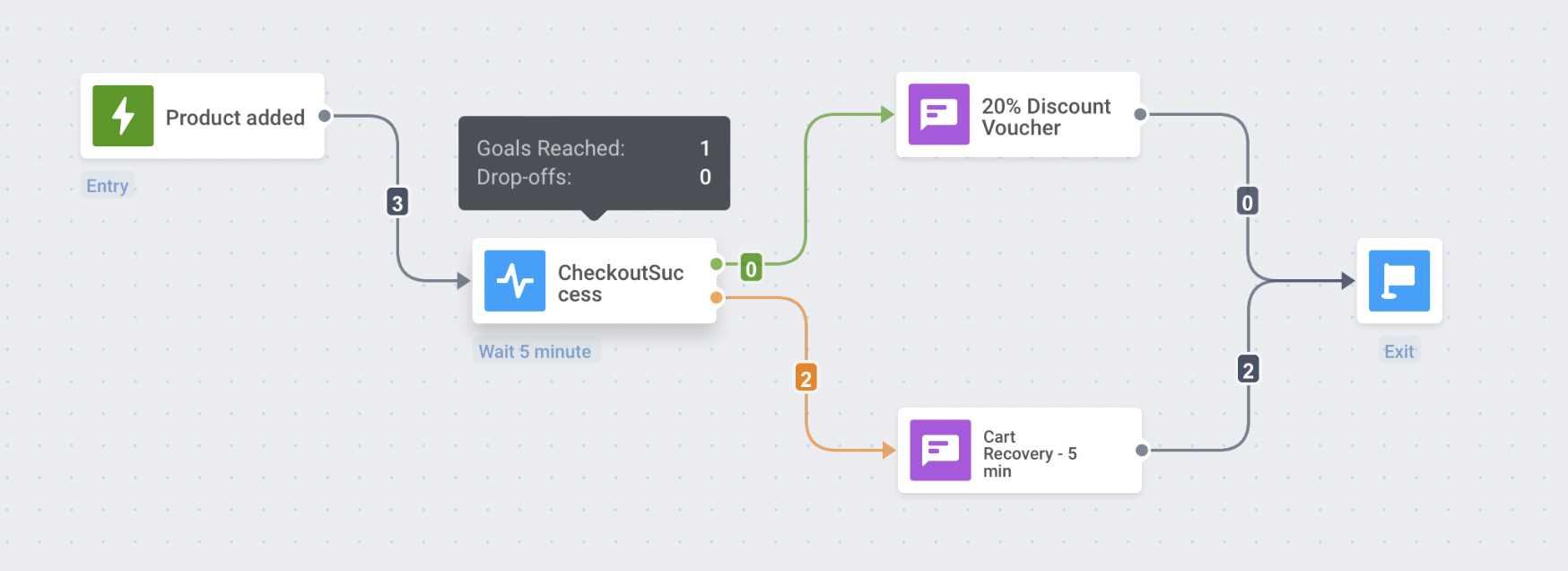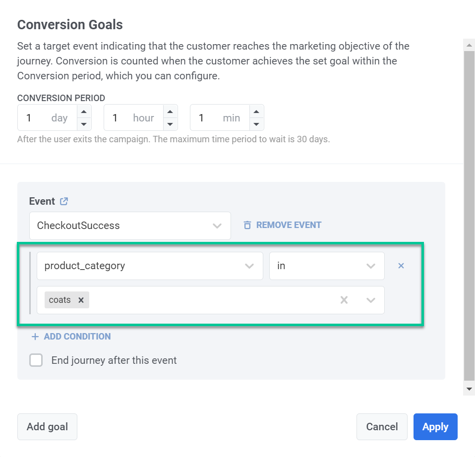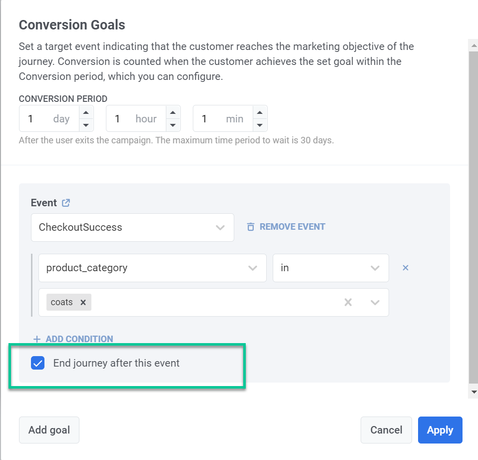 Чтобы отменить оставшиеся сообщения после того, как пользователь достигнет Conversion Goal, установите флажок End journey after this event. Сообщения, которые не были отправлены к моменту достижения цели, не будут отправлены клиенту, достигшему цели.