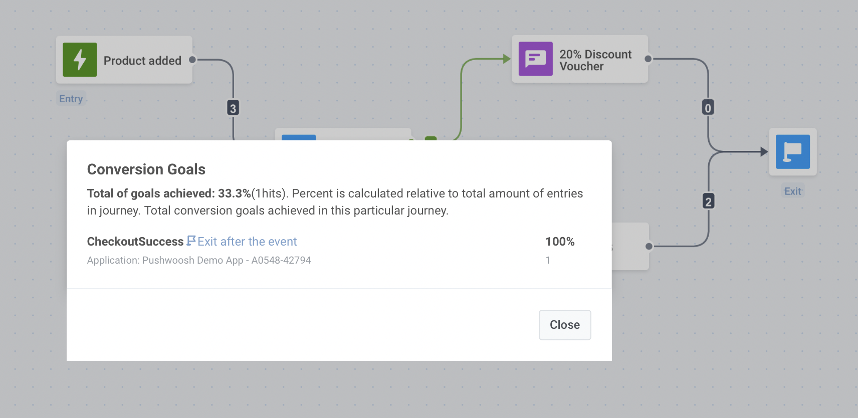 Когда Journey активен, нажмите кнопку Conversion Goals, чтобы увидеть статистику:
