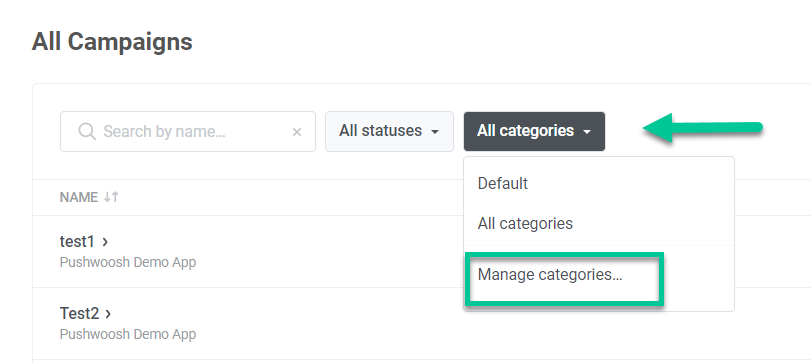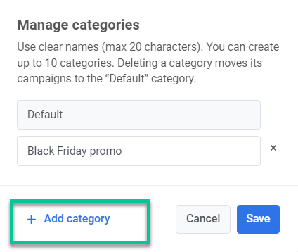Section titled “Категории Journey”С помощью Wavesend вы можете легко организовывать ваши Journey, добавляя пользовательские категории в список кампаний. Вы можете создать до 10 персонализированных категорий в соответствии с вашими потребностями.