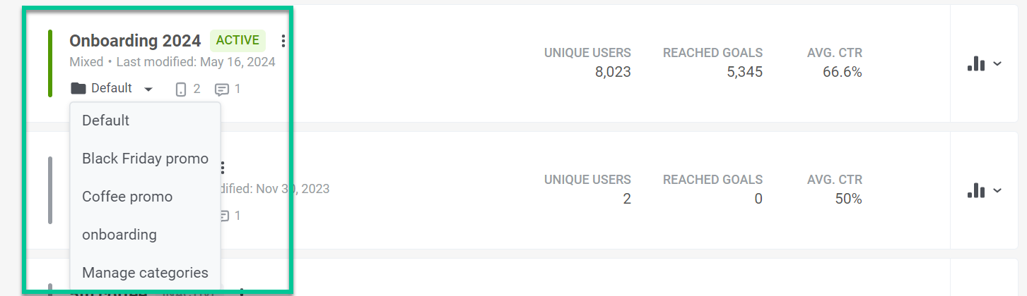 Section titled “Поиск и фильтрация ваших Customer Journey”Вы можете искать кампании по названию, используя строку поиска вверху, или фильтровать кампании по типу, категории или доступным статусам, включая: