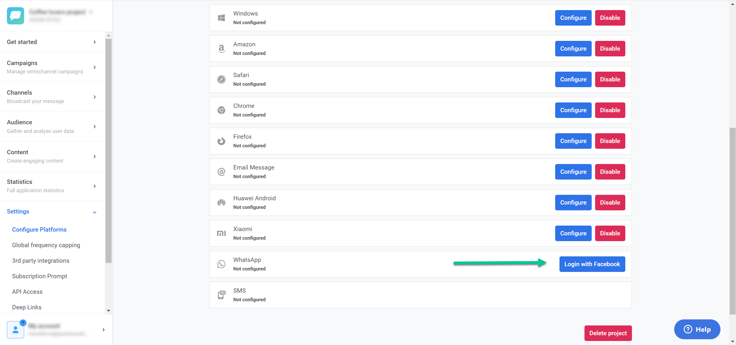 Либо перейдите в Настройки > Настроить платформы. Найдите WhatsApp в списке доступных платформ и нажмите Войти через Facebook рядом с опцией WhatsApp.
