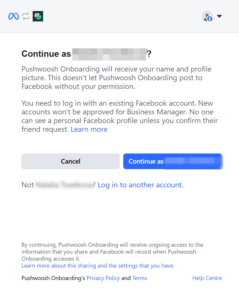 Если отображается неверный аккаунт, нажмите Войти в другой аккаунт, чтобы переключиться на нужный аккаунт Facebook с доступом к Business Manager. Убедитесь, что вы используете существующий аккаунт Facebook, так как новые аккаунты не могут быть одобрены для Business Manager.
