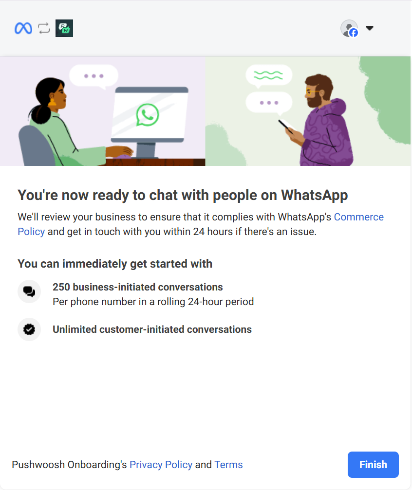 - Далее вы увидите экран подтверждения, сообщающий о завершении настройки WhatsApp. Затем Facebook проверит вашу компанию на соответствие их Торговой политике. Эта проверка обычно происходит в фоновом режиме, и с вами свяжутся только в случае возникновения проблемы, как правило, в течение 24 часов.