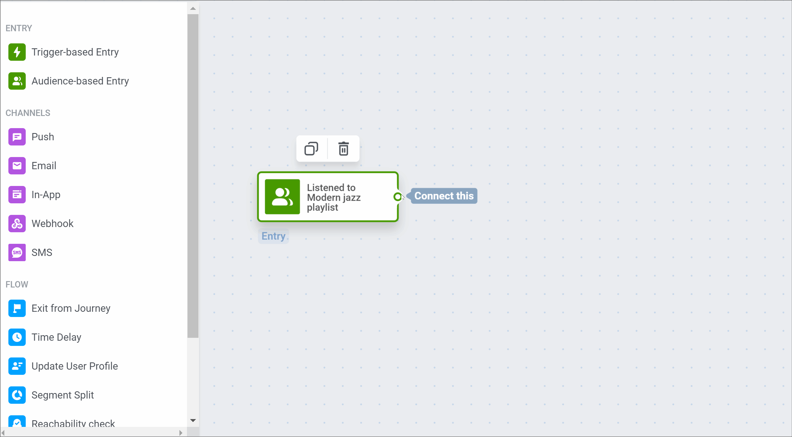 Section titled “1. Точка входа”Мы хотим запустить целевую кампанию по возвращению для тех, кто ранее слушал наш плейлист с современным джазом. Поэтому мы добавим точку входа на основе аудитории (Audience-based entry) и выберем в качестве источника аудитории Segment Listened to Modern jazz playlist (слушали плейлист с современным джазом):