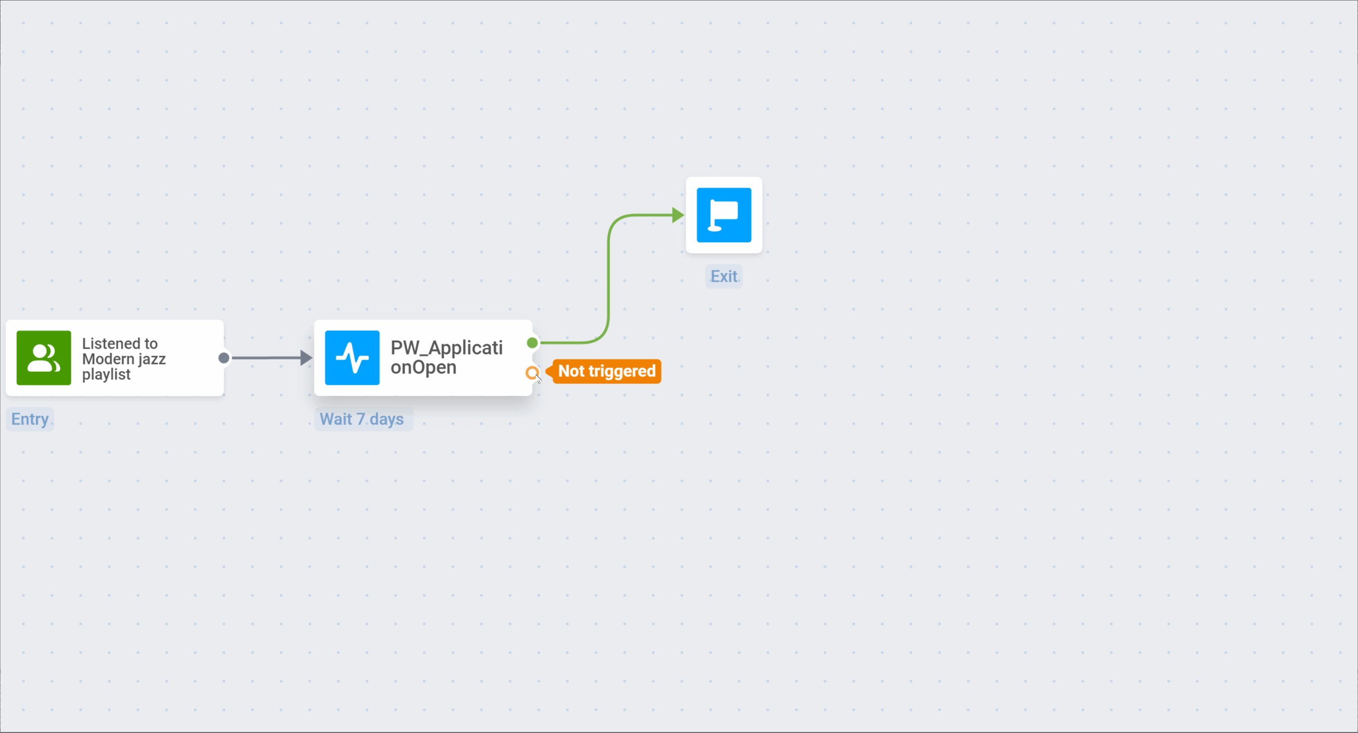 Section titled “2. Ожидание открытия приложения пользователями”Мы будем ждать семь дней, пока аудитория из точки входа откроет приложение. Для этого мы добавим элемент Wait for Trigger и выберем предустановленное Event PW_ApplicationOpen с семидневным периодом ожидания: