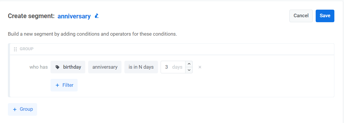 Настройка сегмента для включения пользователей за определенное количество дней до или после даты годовщины позволяет осуществлять взаимодействия до или после нее.