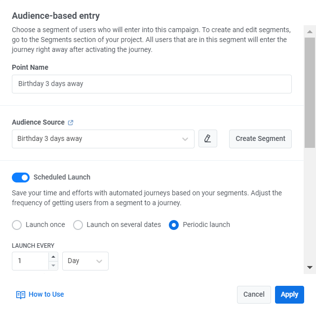 Audience-based Entryвыберите Периодический запуск и настройте ежедневный запуск кампании с помощью Scheduled Launch. Узнать больше