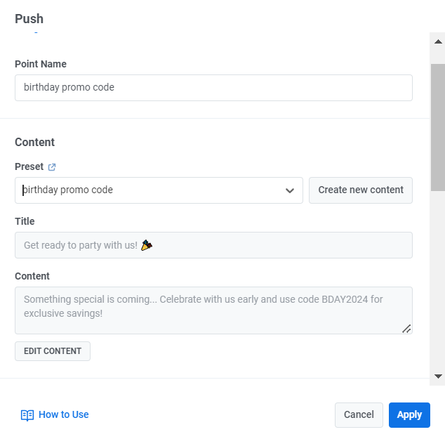 - Добавьте элемент Push на Journey canvas и создайте персонализированное сообщение с промокодом к предстоящему дню рождения, например: «Скоро кое-что особенное… Отпразднуйте с нами заранее и используйте код BDAY2024 для эксклюзивной скидки!»