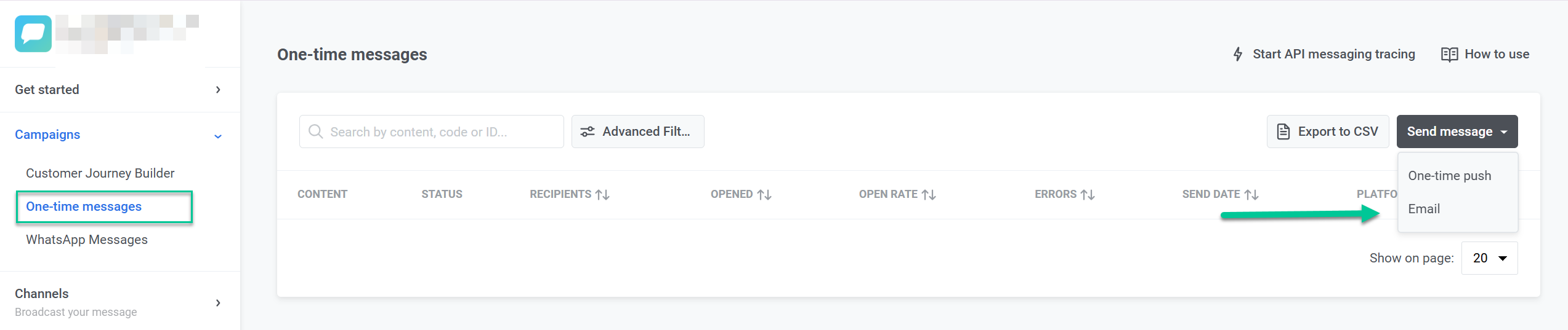 1. Сначала перейдите в Campaigns и выберите Разовые сообщения. Нажмите Отправить сообщение, затем выберите Отправить email, чтобы начать настройку разовой email-кампании.