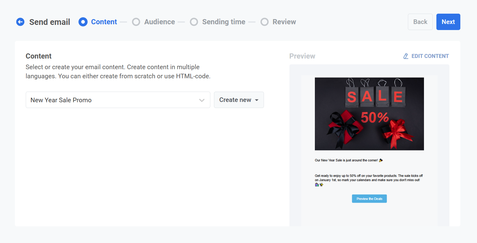 - Если вам нужно создать новый контент, вы можете создать его с нуля с помощью Drag and Drop Editor или использовать HTML-код. Для этого нажмите Создать новый и выберите вариант, который лучше всего соответствует вашим требованиям. Узнайте больше о создании контента для email-сообщений