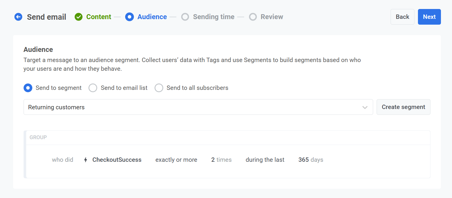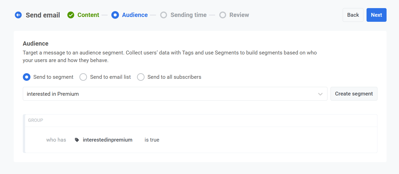 После того как вы настроили аудиторию, нажмите Далее, чтобы перейти к шагу планирования вашей email-кампании.