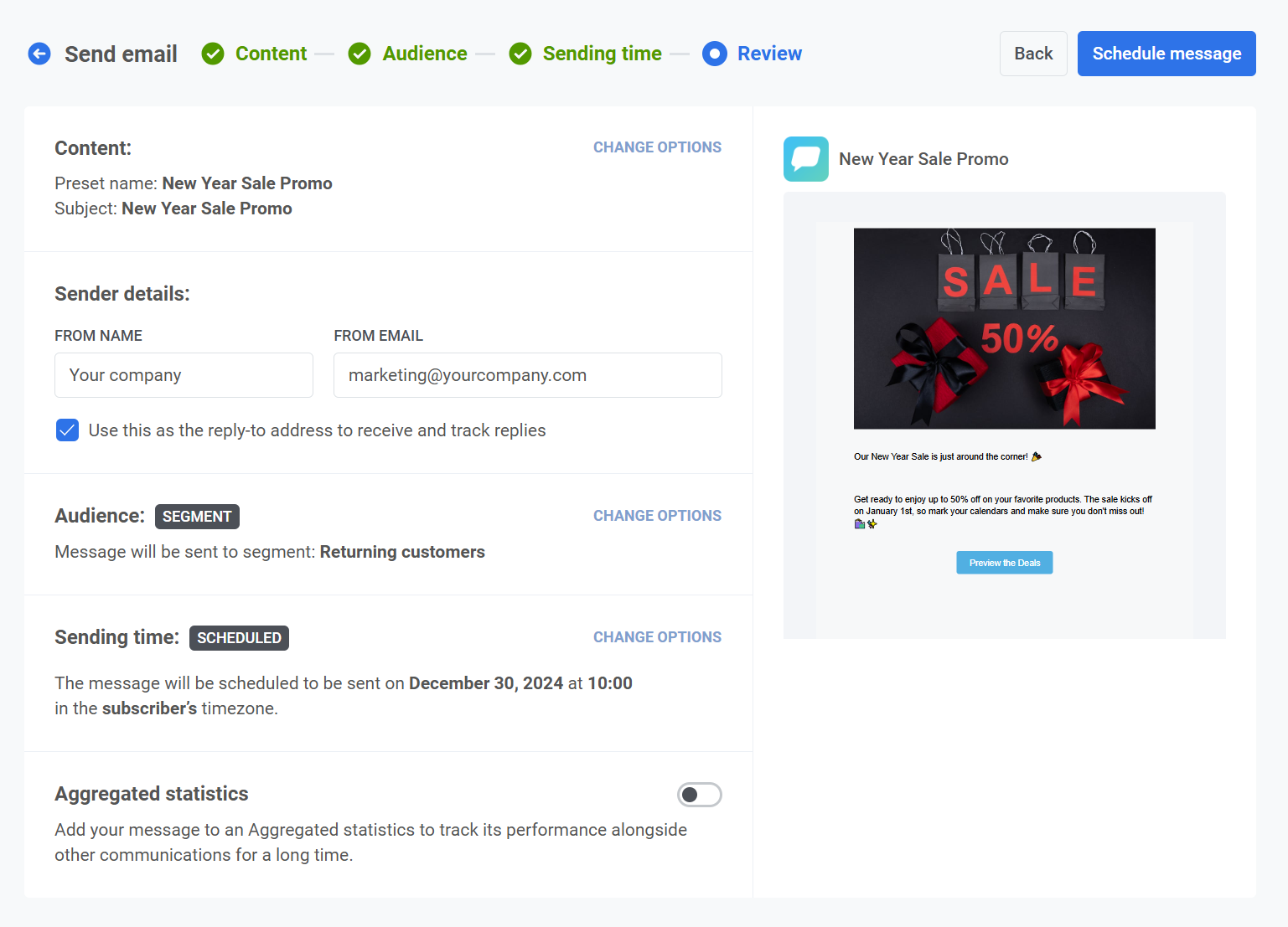 Section titled “Проверьте и отредактируйте ваш контент”На последнем шаге проверьте контент вашего email-сообщения и настройки кампании, включая аудиторию и время отправки. Вы также увидите предварительный просмотр вашего email-сообщения на каждом выбранном языке. Внимательно просмотрите все детали перед завершением кампании, чтобы убедиться, что она соответствует вашим целям. Вы можете при необходимости скорректировать любые настройки.
