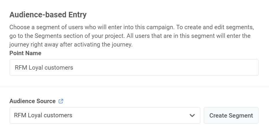 - Дважды щелкните элемент входа, чтобы настроить аудиторию. Вы можете выбрать существующий segment или создать новый на основе своих критериев. Пошаговое руководство по созданию Segment можно найти в этом руководстве.