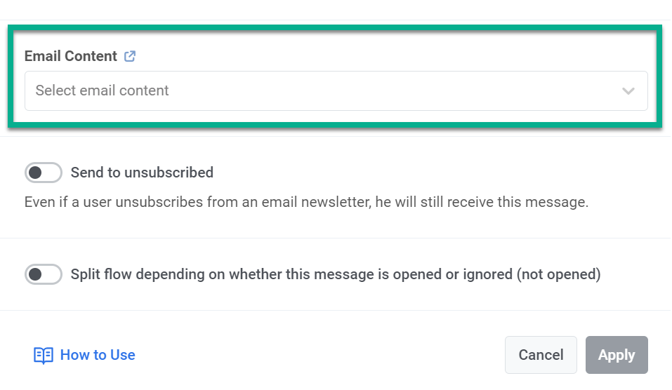 - После выбора контента решите, хотите ли вы отправлять email-сообщение только подписанным пользователям. Wavesend отслеживает отписки и соответствующим образом корректирует сегменты. Однако вы также можете включить отписавшихся пользователей, переключив опцию «Отправлять отписавшимся».