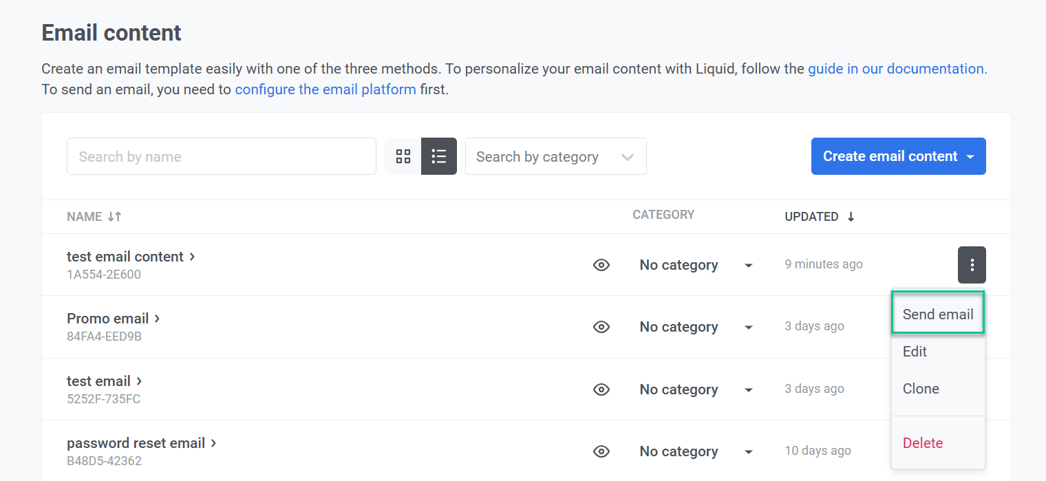 - Чтобы использовать существующий контент, откройте выпадающее меню и выберите нужный контент для email-сообщения.