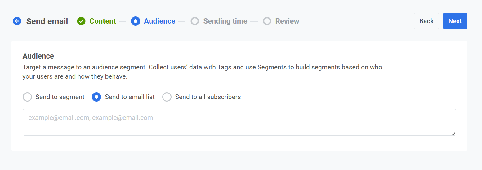 Section titled “Выберите аудиторию для вашей email-кампании”На шаге Audience определите, кто получит ваше email-сообщение. Wavesend предлагает несколько вариантов таргетинга в соответствии с целями вашей кампании: