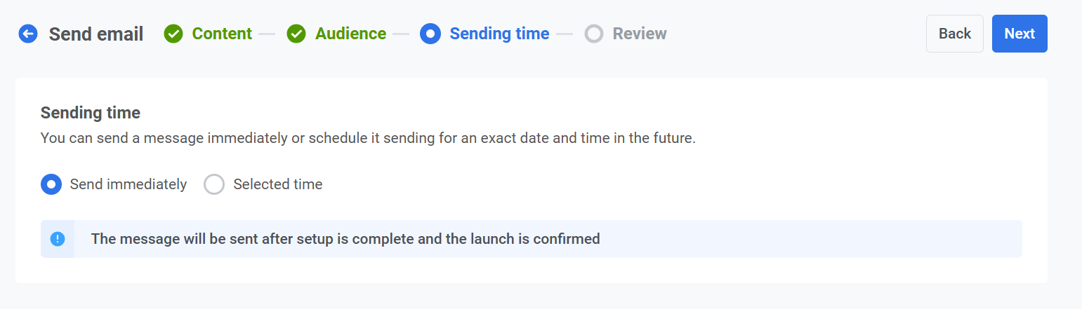 Section titled “Отправить немедленно”Выберите этот вариант, если вы хотите отправить email-сообщение сразу после завершения настройки кампании. Это идеально подходит для срочных или чувствительных ко времени сообщений, требующих немедленной доставки.
