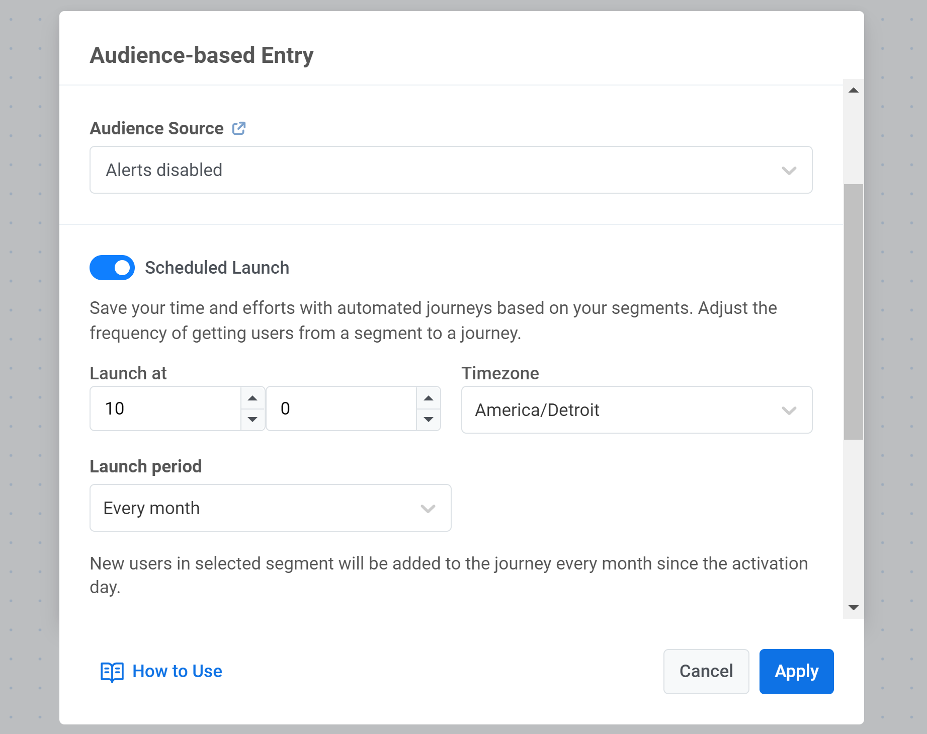 После этого вы можете создать customer journey, начинающийся с Audience-based Entry. Выберите только что созданный Segment и установите запланированный запуск раз в месяц: