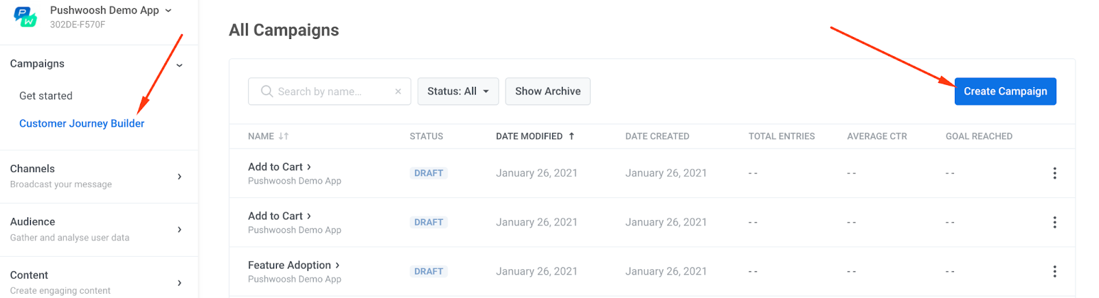 Section titled “Отправка in-app сообщений через Customer Journey”Перейдите в Wavesend Customer Journey Builder → Create Campaign.