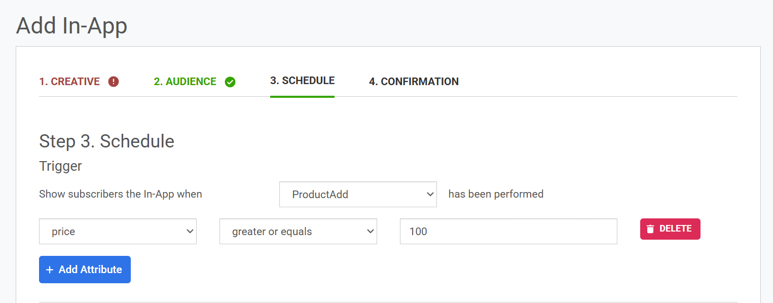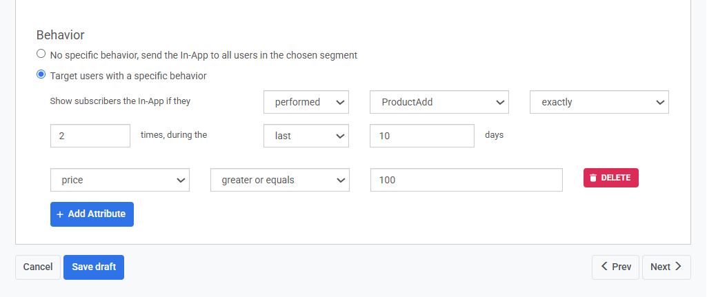 - Нажмите + Add Attribute и установите: Цена больше или равна 50$, чтобы нацелиться на пользователей, добавляющих товары высокой стоимости.