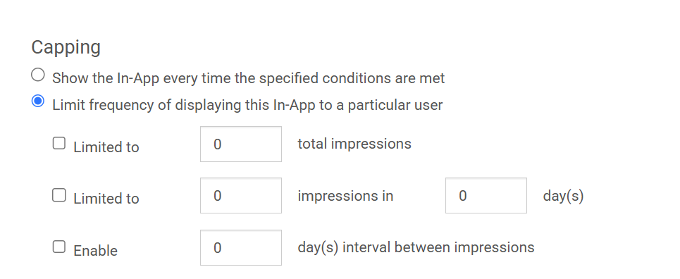 Section titled “Настройте ограничение частоты показов”Настройки ограничения частоты показов (кэппинга) контролируют, как часто in-app сообщение показывается пользователям.