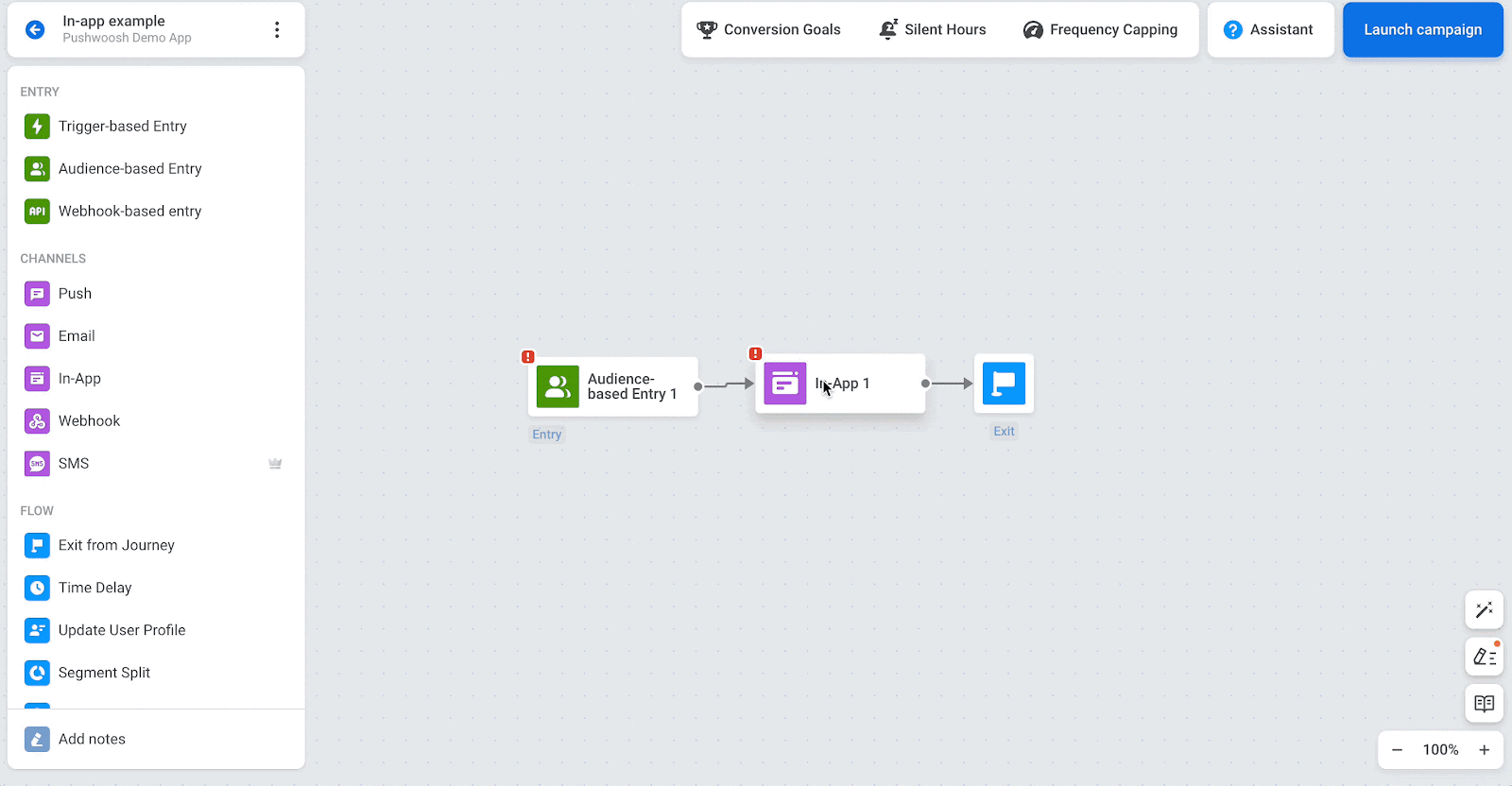 Перетащите следующие элементы на ваш холст: Entry, In-App и Exit. Соедините элементы: