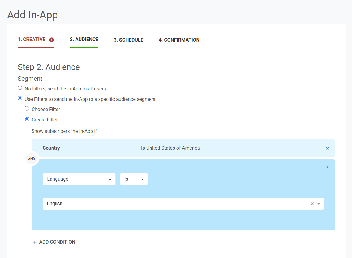 Чтобы уточнить аудиторию, нажмите + ADD CONDITION, чтобы добавить больше критериев.