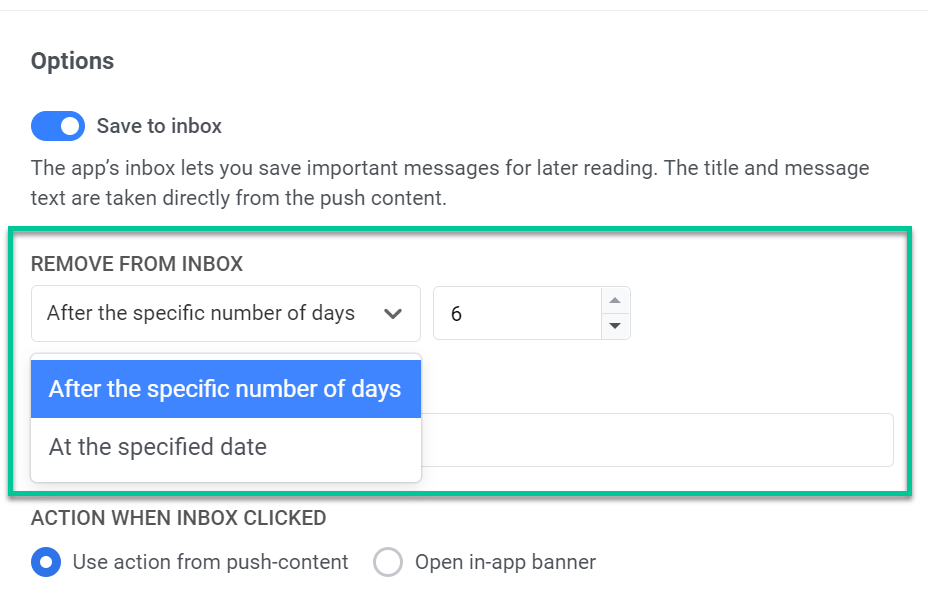 Section titled “Настройка действия при клике на сообщение во входящих”Определите, что произойдет, когда пользователь нажмет на уведомление, сохраненное во входящих. У вас есть два варианта: