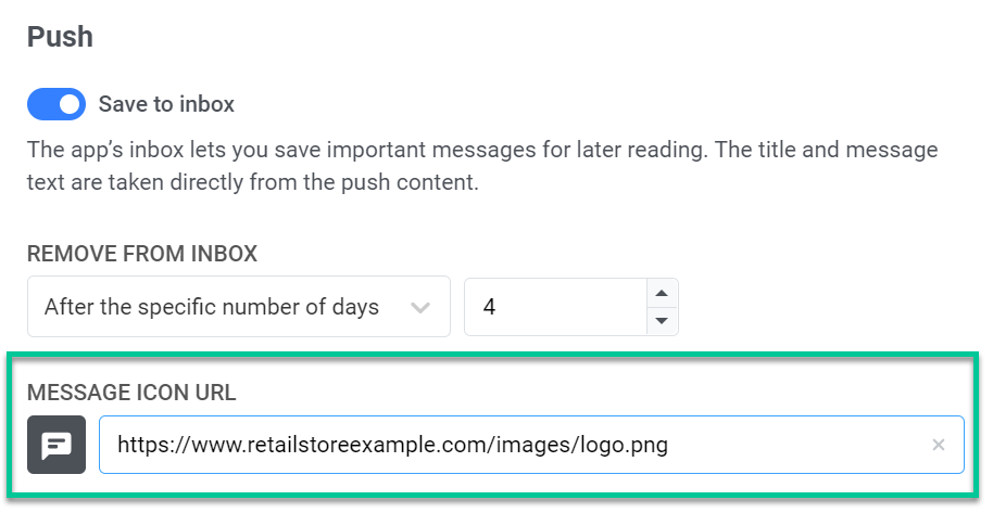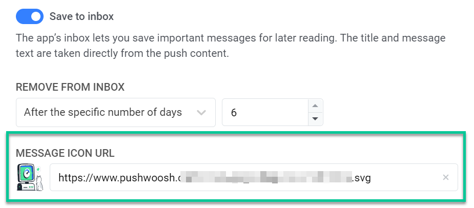Section titled “Настройка иконки сообщения”Вы можете настроить внешний вид сохраненного уведомления, указав URL иконки. Эта иконка будет отображаться рядом с сообщением во входящих и служить визуальным идентификатором уведомления.