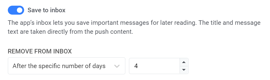 - В форме контента Push-уведомления включите опцию Сохранить во входящие. Поскольку акция действительна только 4 дня, настройте опцию Удалить из входящих на удаление сообщения через 4 дня.