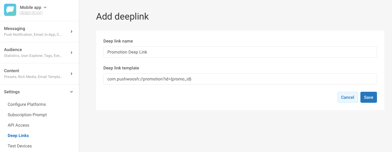 Приведённый ниже пример иллюстрирует глубинную ссылку со схемой com.wavesend, названием страницы promotion и параметром запроса id с плейсхолдером promo_id: