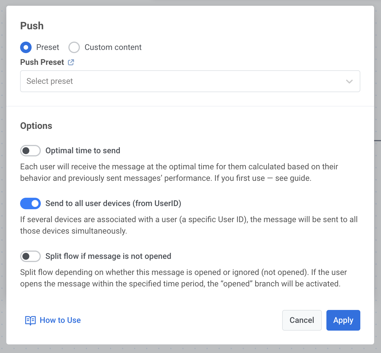 Section titled “Отправка push-уведомлений на все устройства пользователя с помощью Wavesend Journey”Чтобы отправить push-уведомление на все устройства пользователя, нажмите на значок push-уведомления в вашем Journey и прокрутите вниз до опций. Включите опцию Отправить на все устройства (по User ID) и нажмите Применить.