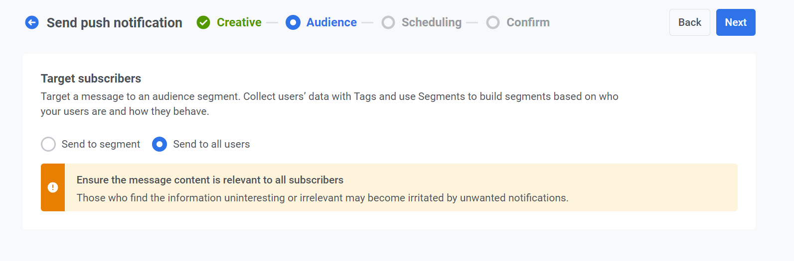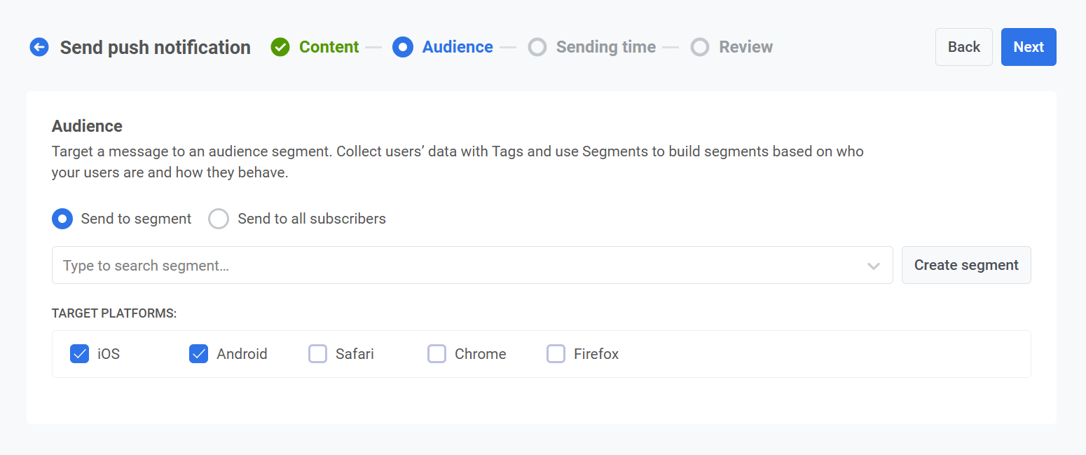 После того как вы настроили Audience и выбрали целевые платформы, нажмите Далее, чтобы продолжить настройку push-уведомления.