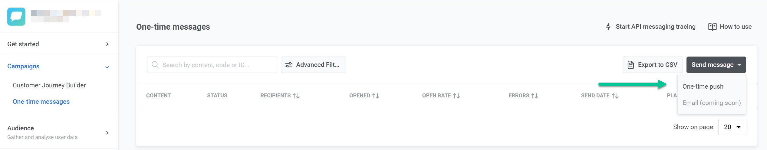 Чтобы отправить разовое push-уведомление в Wavesend, перейдите в раздел Кампании. Выберите Разовые сообщения и нажмите Отправить сообщение → Разовый push.