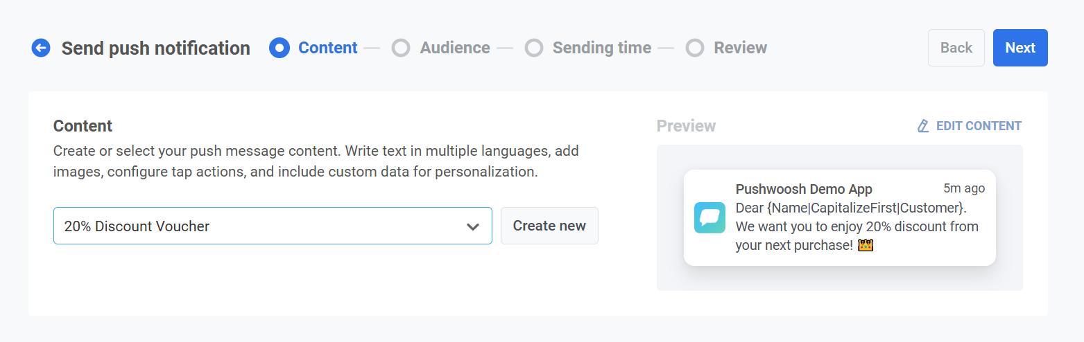 Чтобы создать новое сообщение, нажмите Создать новый и следуйте этому руководству, чтобы настроить новый пресет push-уведомлений.