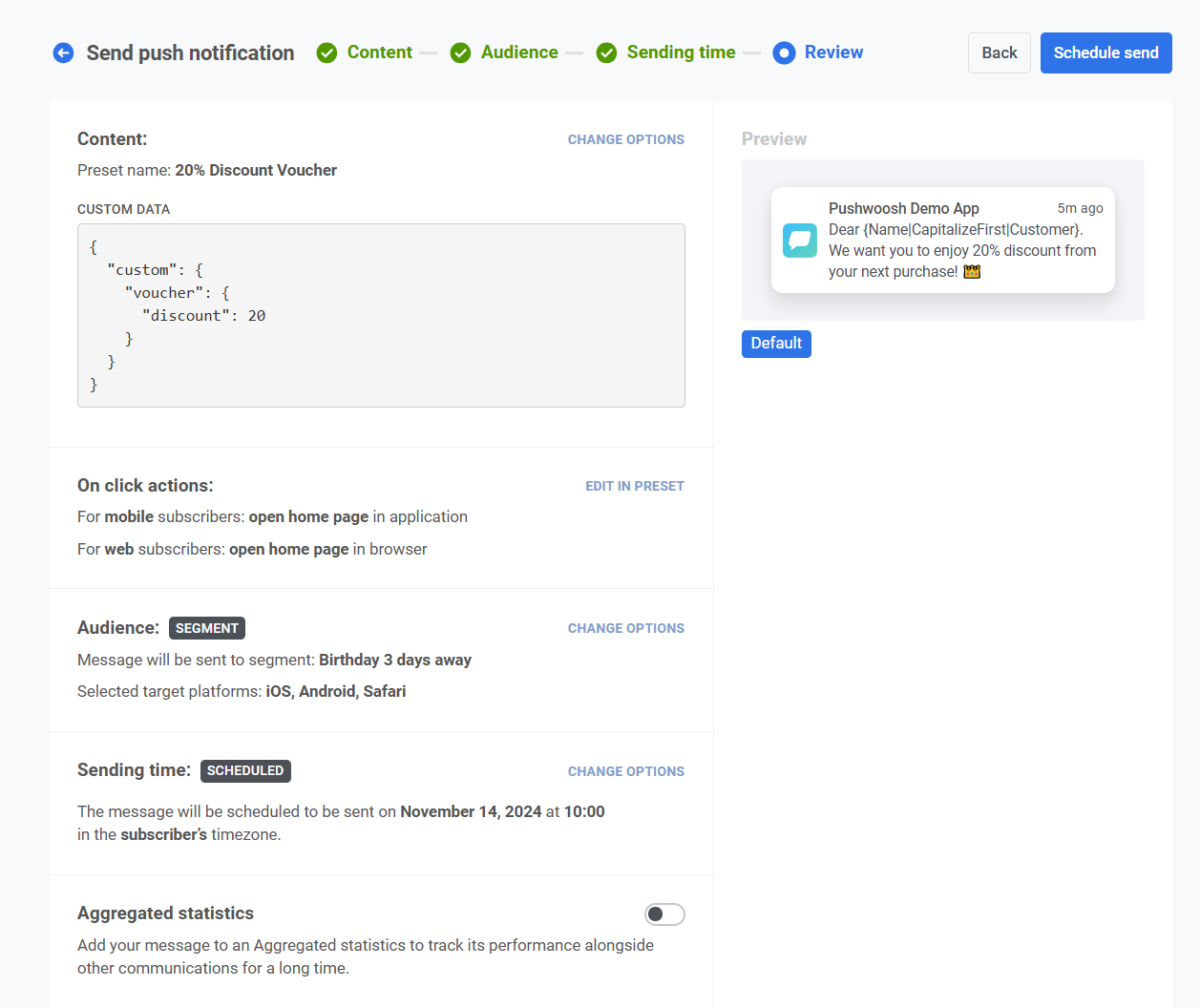 Section titled “Проверьте и отредактируйте контент”Перед завершением проверьте контент, действия по клику, Audience, платформу и параметры планирования, чтобы убедиться, что все настроено правильно. Вы также увидите предварительный просмотр вашего push-уведомления на каждом выбранном языке. При необходимости вы можете изменить любые настройки.