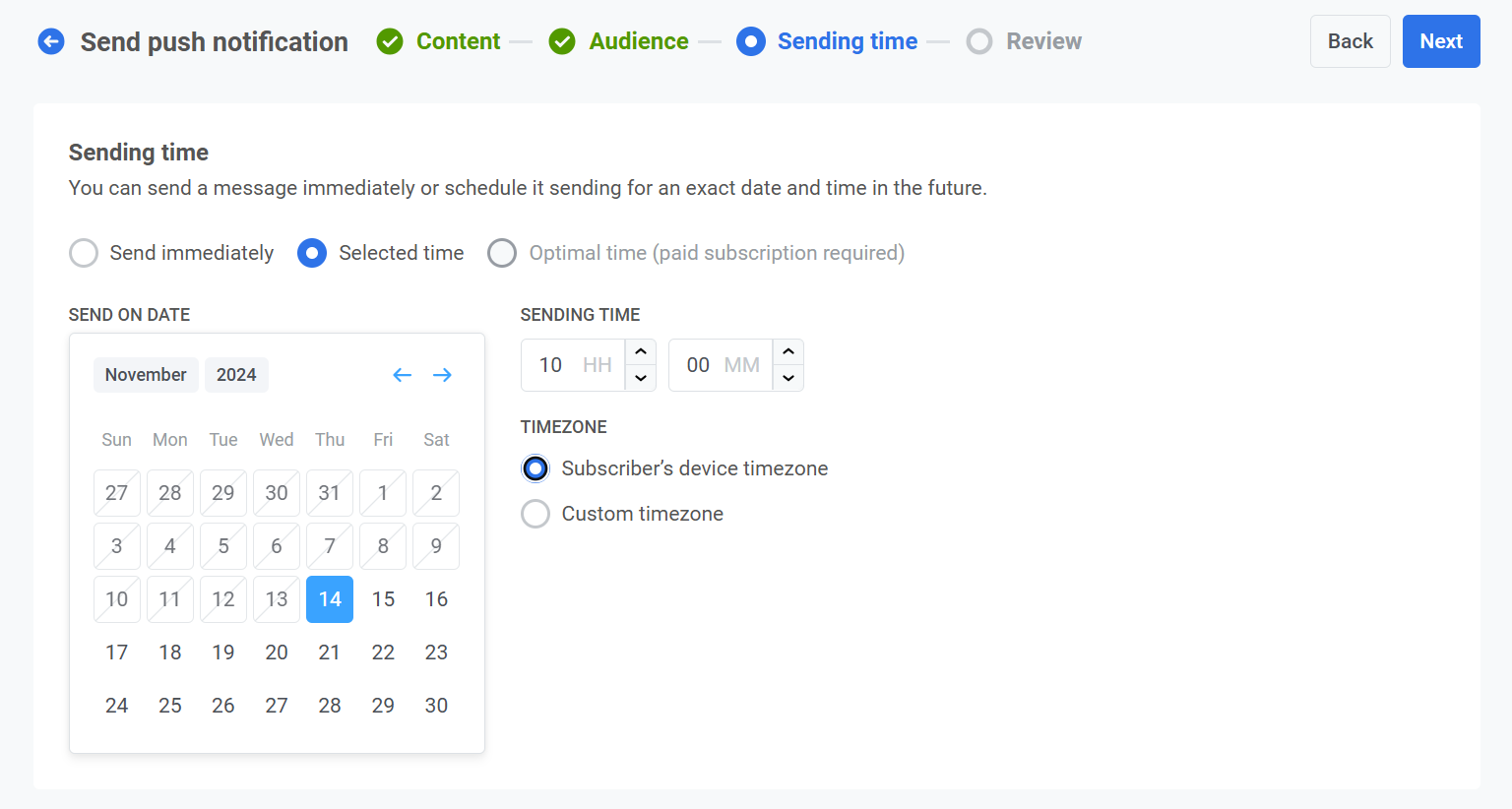 - Пользовательский часовой пояс. Выберите конкретный часовой пояс, чтобы запланировать уведомление для всех получателей, что полезно для таргетинга на пользователей в определенном регионе.
