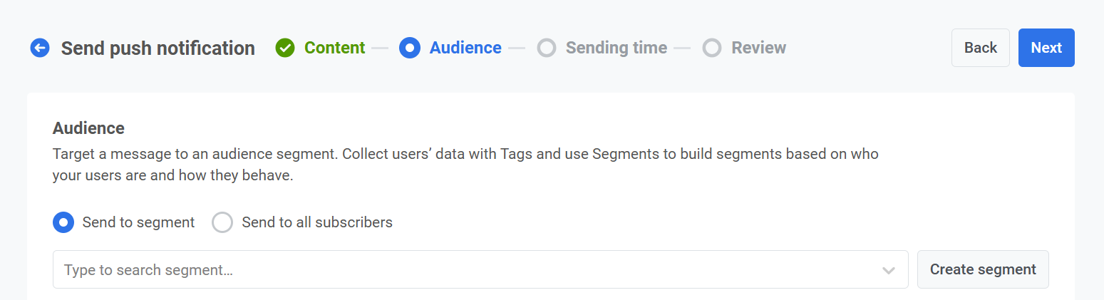 Section titled “Выберите Audience для push-уведомления”Далее выберите Audience для вашего push-уведомления. Вы можете отправить уведомление всем пользователям или нацелиться на определенный Segment на основе поведения или демографических данных пользователей.